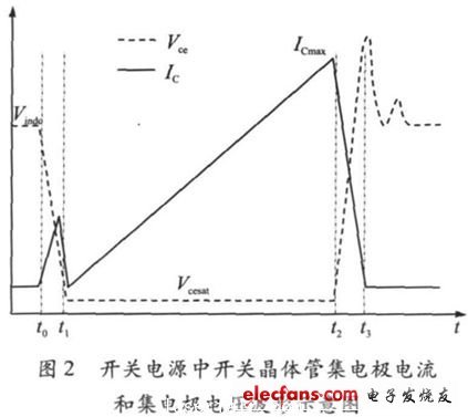 關(guan) 晶體(ti) 管在工作過程中的損耗分為(wei) 開關(guan) 損耗和穩態損耗, 其中開關(guan) 損耗包括導通損耗和關(guan) 斷損耗, 穩態損耗包括通態損耗和截止損耗, 其中截止損耗占總的損耗的比率很小, 可以忽略不計。我們(men) 把Vce由90% Vindc降到110% Vcesat所用的時間定義(yi) 為(wei) 導通延時, 即圖2中的t1 - t0, 把IC 由90% Icmax下降到0所用的時間定義(yi) 為(wei) 關(guan) 斷延時, 即t3 - t2。
