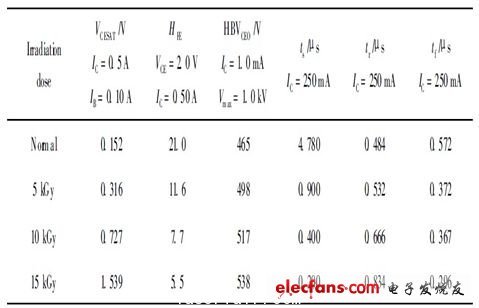 從(cong) 表1中我們(men) 可以看到, 經過輻照後, 儲(chu) 存時間ts 隨著輻照劑量的增大有很大幅度的減小, 下降時間tf 有所減小, 上升時間tr 有所增加; 電流放大係數隨著輻照劑量的增加而下降; 飽和壓降和擊穿電壓HBVceo隨輻照劑量的增大而增大。