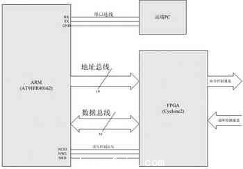 圖1為(wei) 此係統的結構連接框圖。如圖所示,ARM芯片與(yu) FPGA芯片之間通過數據總線、地址總線及讀寫(xie) 控製線相連,而與(yu) 終端PC則通過串口通信;FPGA與(yu) 目標設備通過命令控製總線和故障檢測總線相連。