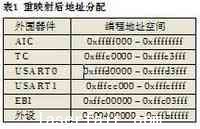 由於(yu) 重映射主要是用於(yu) Flash和片內(nei) RAM的地址空間交換,所以片內(nei) 外圍接口(EBI、USART、TC)對應的存儲(chu) 器編程地址範圍在映射前後不發生改變,而訪問外設地址為(wei) 重映射後所分配。重映射後地址分配如表1所示。