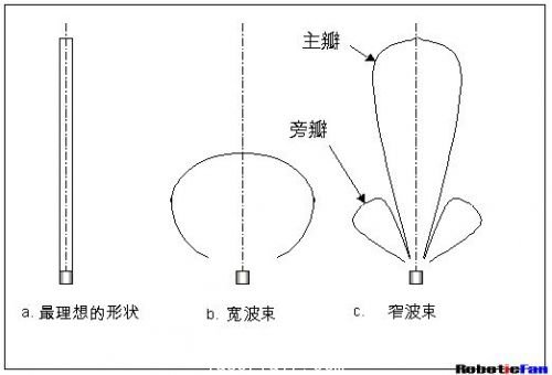 對於(yu) 機器人的應用來說,超聲波傳(chuan) 感器主要用來探測物體(ti) 的距離以及相對於(yu) 傳(chuan) 感器的方位,以便可以進行避障動作。最理想就是矩形,不但可以準確的獲得物體(ti) 的距離值,也可以準確的獲得方位值,就是正前方。但是實際上,超聲波的波束根據應用不同,有寬波束,和窄波束。寬波束(圖1-b)的傳(chuan) 感器會(hui) 檢測到任何在波束範圍的物體(ti) ,它可以檢測到物體(ti) 的距離,但是確無法檢測到物體(ti) 的方位,誤差最高會(hui) 有100度左右,機器人將無法準確的確定其避障的動作。當然,作為(wei) 隻要探測物體(ti) 有或者無的用途來說,寬波束的傳(chuan) 感器是比較理想的。同理,窄波束可以相對寬波束獲得更加精確的方位角。在選擇超聲波傳(chuan) 感器的時候,這個(ge) 波形特性是必須要考慮的。