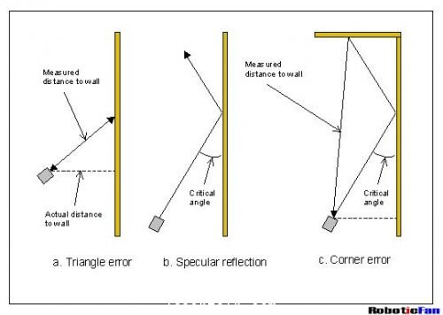 圖2.c中的情況可以叫做多次反射。這種現象在探測牆角或者類似結構的物體(ti) 時比較常見。聲波經過多次反彈才被傳(chuan) 感器接收到,因此實際的探測值並不是真實的距離值。