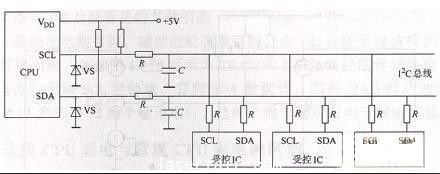 直接式I2C總線是指被控集成電路直接或通過電阻掛在I2C總線上,其電路工作原理圖如圖4所示。因為(wei) CPU的I2C總線輸出端口內(nei) 部電路形式為(wei) 集電極開路(或漏極開路)形式,所以在CPU的I2C總線輸出端必須通過上拉電阻R接+5V電源,為(wei) CPU的I2C總線輸出端口的內(nei) 部電路供電。圖4中的電阻R為(wei) 隔離電阻,C為(wei) 抗幹擾電容,主要是為(wei) 了提高I2C總線上數據傳(chuan) 輸的可靠性,防止誤動作進人維修狀態和防止由於(yu) 外部幹擾信號改變I2C總線數據。穩壓管VS是為(wei) 了防止外部高電壓損壞CPU的I2C總線輸出端的內(nei) 部電路。