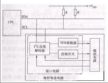 I2C總線上傳(chuan) 輸的是數字信號,如果I2C總線上掛接的被控集成電路為(wei) 模擬電路,為(wei) 便於(yu) 與(yu) 被控模擬電路通信,在被控對象中需要增加I2C總線接口電路,受控IC中I2C總線接口電路工作原理圖如圖2所示。接口電路一般由I2C控製器和控製開關(guan) 等電路組成。由CPU送來的數據信息經譯碼器譯碼後控製信號才能對被控IC執行控製操作。被控對象通過I2C總線接口電路接收由CPU發出的控製指令和數據,實現CPU對被控對象的控製。