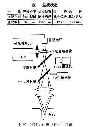 圖10示出監視頭的構成。監視時,以光軸和同軸抽出焊接狀況的圖像,同時分光、探測焊接部的發光。為(wei) 了使熔深加深,采用脈衝(chong) 振蕩。根據焊接狀況圖像,對熔池形狀和焊接坡口線位置進行圖像處理,並向操作人員提供視覺信息。焊接部的發光抽出,與(yu) 以前所實施的采用多條監視光纖的方法對應,因為(wei) 焊接頭所要求的空間製約條件並不嚴(yan) 格,用一根監視光纖把用半反射鏡分出的光抽出。下表中示出焊接部發光的抽出方法。這裏采用的是在抽出焊接參數、激光器輸出、焦點位置變化的同時,探測穿透焊接時內(nei) 部波穩定性和焊接保護狀況。