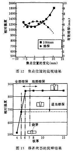 圖11示出焊接輸出的監視結果與(yu) 熔深深度的比較。從(cong) 此結果中可以看出,熔深深度變化0.4mm時,就可探測到輸出功率100W左右的焊接變化。圖12示出焦點位置和YAG激光器反射光及熔深深度的關(guan) 係。這裏雖然采用焦點深度Bf=200mm的大透鏡,但是可以探測士4mm的熔深變化。圖13示出穿透和未穿透時的發光強度變化。穿透焊接時,因為(wei) 熔融金屬在板內(nei) 穿過,所以發光強度下降,於(yu) 是就能探測到可以獲得穩定的內(nei) 部波焊道的狀態。