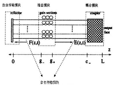 這是一個(ge) N路光纖激光器陣列耦合的示意圖。在z=O處為(wei) 一個(ge) 反射率接近100%的全反射鏡。而在腔體(ti) 的另一端,即z=L處為(wei) 一個(ge) 反射率較小的反射鏡,光纖激光器陣列的輸出光就是從(cong) 此處輸出。在g-<z<g+之間為(wei) 增益區間,我們(men) 認為(wei) 所有的增益介質隻存在於(yu) 這個(ge) 區域內(nei) 。在c-<z<L之間為(wei) 耦合區間,各路激光的耦合就是在這個(ge) 區間完成的。那麽(me) 我們(men) 認為(wei) 激光在整個(ge) 腔體(ti) 的其他部分,即O<z<g-和g+<z<c-區間都是自由傳(chuan) 輸的。