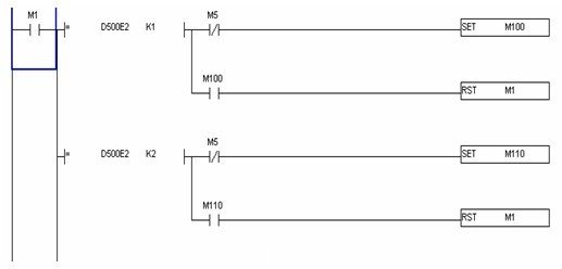 M11對應人機界麵上按鍵取物氣動,當按下按鍵後將按鍵對應的數值存儲(chu) 在PLC,D500開始的區間內(nei) ,使用E1做地址修飾。然後將E1自增1,複位M11,表示一個(ge) 動作已經存儲(chu) 完畢。用戶隻需要按安照工藝順序依次按下按鍵即可將動作順序存入PLC,根據PLC中存儲(chu) 的順序調用子程序。 當自動運行開始M1標誌有效,E2是自動程序順序指針初始值是1代表程序執行用戶所輸入的第一個(ge) 動作,每執行一個(ge) 動作E2自增一也就是D500E2地址偏移一個(ge) 位置。M100為(wei) 調用子程序標誌。每一個(ge) 動作就是一個(ge) 子程序。 2、程序修改方法 當按下清除一步M2636標誌位有效,將指針計數E1自減1(即將D500E1地址倒退一步)並且將當前步的按鍵數值清除,並且複位M2636。程序也提供程序全部清除功能,如果需要也可以增加插入或修改某一條功能。 3、提供用戶所編寫(xie) 工藝程序顯示畫麵,在編寫(xie) 程序時候用戶可以隨時檢查輸入是否正確。具體(ti) 實現方法如下: 使用一般型信息顯示組件,將新增刪除狀態總數設置成256如下圖,數值單位WORD讀取地址D500通過更改組件編即對應D500數據區數值來顯示用戶所編寫(xie) 的工藝程序。
