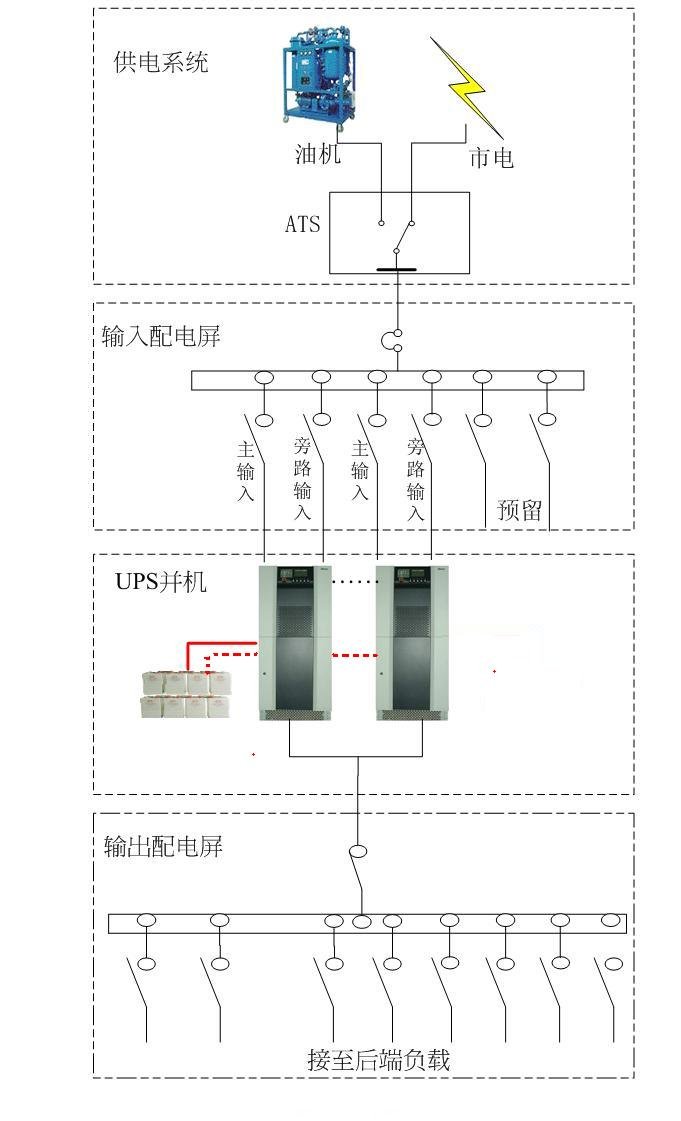 該方案UPS輸入采用ATS自動轉換開關(guan) ,由2路市電供電。正常情況下,ATS自動轉換開關(guan) 投擲到市電1的位置,市電1作為(wei) 主輸入電源,市電2作為(wei) 備用輸入電源,如果市電1中斷,ATS自動轉換開關(guan) 將自動切換至市電2供電;當市電1恢複供電後,ATS自動切換由市電1供電。隻有市電1和市電2都斷電的情況下UPS才由電池供電。