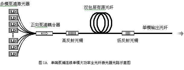 圖1A是一種典型的單端泵浦連續單模大功率全光纖激光器的光路示意圖。單端泵浦結構簡單,但有源區增益呈指數衰減,分布極不均勻,適合功率不是非常高的情況。