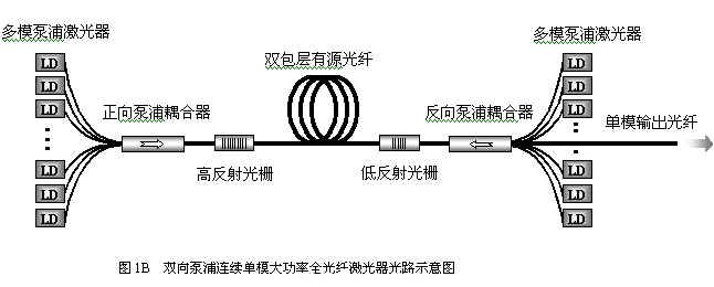 圖1B為(wei) 典型的雙向泵浦連續單模大功率全光纖激光器的示意圖。雙向泵浦結構相對複雜,但有源區增益分布均勻性得到改善,可實現更高功率輸出。