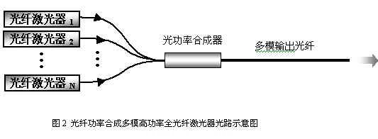 圖2為(wei) 采用光纖功率合成技術製作多模光纖激光器的光路示意圖,采用這種技術,可將多個(ge) 單模連續光纖激光器的輸出功率合成起來,獲得數萬(wan) 瓦或更高的光功率輸出並且光束質量良好。