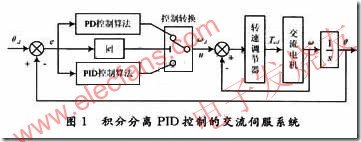 積分分離PID控製交流伺服係統結構如圖1所示。圖中θd為(wei) 給定角位移,θ為(wei) 電機轉軸的實際角位移,e為(wei) θd和θ進行比較而得到的偏差,則有: