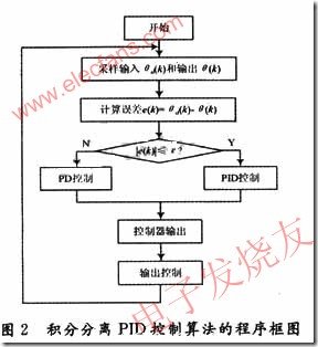 在PID控製中,積分環節的作用是消除靜態誤差,提高係統的控製精度。如果在誤差較大的初始階段引入積分環節,會(hui) 造成:PID的積分累積,從(cong) 而引起係統較大的超調。因此,本文針對PID控製的特點,設計了一種積分分離的控製方法,積分分離PID控製算法的程序框圖如圖2所示。