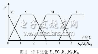 DC轅AC逆變電源控製的主要是輸出電壓及頻率的準確性。頻率的準確性由PWM發生器決(jue) 定(它是一個(ge) 存貯在存儲(chu) 器內(nei) 的一個(ge) 正弦輸出表格),隻要觸發計算準確就能達到設計要求。負載的變化使輸出電流產(chan) 生變化,對於(yu) 一定脈寬輸出的DC轅AC電源來說,勢必導致輸出電壓的變化。因此采用模糊控製規則根據不同的渣e渣和渣ec渣,對PID控製器的參數kp、ki、kd進行在線自整定來調節輸出電壓。模糊控製器的輸入變量是偏差絕對值渣E渣、偏差變化率絕對值渣EC渣,