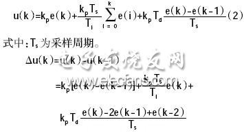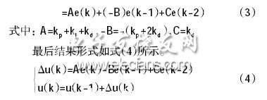 本文采用TMSLF2407實現數字PID控製,對式(1)進行離散化,可得到式(2)PID 控製的離散形式,為(wei) 了增加係統的可靠性,采用增量式PID控製算式,式(2)為(wei) 第k 次PID控製器的輸出量,減去第k-1次PID 控製器的輸出量即可得到式(3)增量式PID 控製算式。