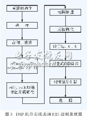 為(wei) 了保證模糊PID 控製的實時性和準確性,DSP在A/D采樣的中斷子程序中就調用模糊PID控製算法程序,立即計算出輸出控製量並送到被控對象,根據TMSLF2407 的性能,機器時鍾周期和中斷延時可以計算出本係統從(cong) 采樣當前實際輸出值到輸出控製量大約需要6.67 滋s ,這對於(yu) 1ms一次的采樣來說是足夠的,完全滿足實時性要求。程序流程圖如圖3所示。