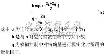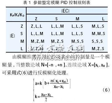 在本文中利用CRI法推理時,控製過程是用查控製表來產(chan) 生控製量的,在控製表中,模糊偏差量渣E渣、模糊偏差變化率渣EC渣,PID控製器的模糊比例增益係數KP、模糊積分增益係數KI和模糊微分增益係數KD都是用其對應整數論域的元素來表示的。對於(yu) 單個(ge) 實時精確量利用式(5),得到的結果再四舍五入,就求出了對應整數論域的相應元素,從(cong) 而實現了輸入量的模糊化。