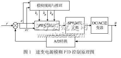 由於(yu) 逆變器傳(chuan) 遞函數不易得到,而且電壓輸出經常波動,傳(chuan) 統的單純PID控製難以達到快速和穩定的響應,而模糊控製與(yu) PID相結合的控製方法,通過對誤差量的變化實時分析,調整PID參數,達到快速響應和無差跟蹤,可實現逆變電源的高精度實時控製。