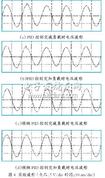 圖4為(wei) 實驗波形,其中(a)、(b )為(wei) PID控製時突減負載、突加負載時的電壓波形。(c)、(d )為(wei) 模糊PID控製時突減負載、突加負載的電壓波形,從(cong) 實驗結果可以看出采用模糊PID控製的方法與(yu) 一般的PID 控製方法相比具有動態響應速度快、超調小,輸出穩定後其幅值變化很小,突加、減負載時電壓變化幅值小的優(you) 點,因而能更有效地抑製負載突變或外界幹擾對電壓的影響。