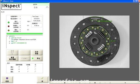 汽車離合器從(cong) 動盤是手排擋有級變速汽車必不可少的易耗損零部件。每個(ge) 從(cong) 動盤的裝配是否合格都要經過嚴(yan) 格的檢測,機器視覺在此環節中起到了無法取代的作用。如圖案例,上海波創電氣有限公司使用DALSA機器視覺係統檢測從(cong) 動盤在裝配過程中是否有鉚釘漏裝,並用字符讀取工具讀取其批號,方便產(chan) 品跟蹤備案。