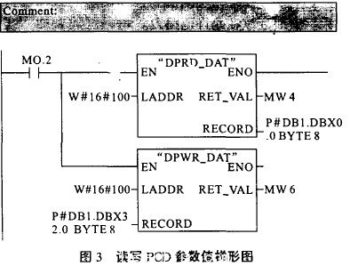 用STEP 7對PCD讀寫(xie) 參數時,調用SFC14、SFC15兩(liang) 個(ge) 係統功能模塊。其中SFC14(“DPRD—DAT”)用於(yu) 讀取 PROFIBU DP從(cong) 站的數據。如果在數據傳(chuan) 送期間沒有出現錯誤,則已讀取的數據將被輸入到有RECORD標識的目標區域中,其目標區域的長度必須與(yu) 用 STEP 7選定的模塊的長度相同。SFC15(“DPWR—DAT”)用於(yu) 將數據寫(xie) 入PRCIFIBUS從(cong) 站,利用SFC15可以將RECORD中的數據一致地傳(chuan) 送到已尋址的DP標準從(cong) 站。數據是同步傳(chuan) 送的,既完成了SFC,也完成了作業(ye) 。其源區域的長度必須與(yu) 用STEP 7選定的模塊組態的長度相同。主要的梯形圖如圖2和圖3所示。#p#分頁標題#e#