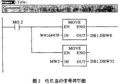 如圖2所示,將047F Hex送到DB1.DBW32,即寫(xie) 入控製字,047F為(wei) 電機的啟動信號。