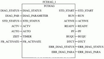診斷和自啟動程序在PC WORX 2.02中功能編程軟件Program Worx上開發,采用ST(結構化文本)語言編程,編程後封裝成功能模塊FCDIAG(見圖1)。該模塊以診斷狀態寄存器、診斷參數寄存器作為(wei) 輸入,經過處理之後把診斷信息賦給全局外部變量ERR DIAG STATUS 和ERR DIAG_PAPA。自啟動功能可以檢測故障是否清除,一旦檢測到故障已經清除後,通過標準功能啟動寄存器,啟動總線運行。