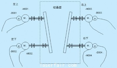 結晶器調寬係統包括:4套絲(si) 杠機構,每個(ge) 窄麵2套;4套帶有旋轉變壓器的交流異步伺服電動機,固定在澆注平台下的冷卻室外;4個(ge) 萬(wan) 向軸、4套交流伺服控製單元。結晶器調寬窄麵控製機械結構,如圖1所示。每一個(ge) 窄麵使用伺服單元控製調寬電機驅動,可以改變兩(liang) 邊寬度和每個(ge) 麵的錐度。由於(yu) 調寬時生產(chan) 的板坯窄麵不是直的,這意味著在調寬期間窄麵銅板與(yu) 坯殼之間的氣隙的產(chan) 生,避免漏鋼,在調整寬度的同時必須調整錐度。為(wei) 了減小凝固坯殼的應力,窄麵的調整應緩慢進行。為(wei) 保證坯殼與(yu) 銅板緊密接觸,結晶器錐度隨寬度的減小而減小,隨寬度增加而加大。控製係統根據鋼種、澆注速度、要求的錐度和板坯定尺,在澆注期間為(wei) 各邊的運動選擇不同的算法。