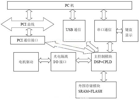 本運動控製器的硬件結構主要分為(wei) 如下幾個(ge) 模塊:DSP+CPLD 主控模塊,包括 DSP 核心 模塊和 CPLD 驅動與(yu) 擴展模塊;通信接口模塊,包括 PCI 總線、USB 總線和串口;I/O 輸入輸 出接口模塊以及外圍存儲(chu) 器模塊,包括 SRAM 和 FLASH。本運動控製器的硬件結構如圖 1 所示。