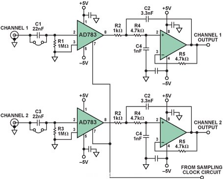 圖1所示為(wei) 一個(ge) 插入式附件的原理圖,它可以配合典型PC聲卡采樣使用。每個(ge) 示波器通道使用一個(ge) 高速采樣保持放大器 AD783 SHA的采樣信號由時鍾分頻器電路的數字輸出提供,下文將通過一個(ge) 例子說明。AD783輸入由一個(ge) FET緩衝(chong) ,因此可以使用簡單的交流/直流輸入耦合。在所示的兩(liang) 個(ge) 通道中,當直流耦合跳線開路且輸入為(wei) 交流耦合時,1 MΩ電阻(R1和R3)提供直流偏置。采樣輸出由圖中所示的雙極點有源RC網絡低通濾波。該濾波器不必是一個(ge) 有源電路,但所示的濾波器能夠提供有益的緩衝(chong) 低阻抗來驅動PC聲卡輸入。