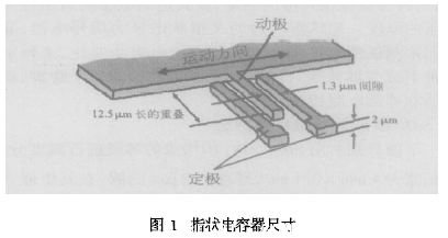 ADXL202是最新的、低重力加速度雙軸表麵微機械加工的加速度計,以模擬量和脈寬調製數字量2種方式輸出,並具有極低的功耗和噪音。表麵微機械加工使加速度傳(chuan) 感器、信號處理電路高度集成於(yu) 一個(ge) 矽片上。和所有加速度計一樣,傳(chuan) 感器單元是差動電容器,其輸出與(yu) 加速度成比例。加速度計的性能依賴於(yu) 傳(chuan) 感器的結構設計。差動電容是由懸臂梁構成,而懸臂梁是由很多相間分布的指狀電容電極副構成,一副指狀電容電極可簡化為(wei) 圖1所示的結構。每個(ge) 指狀電極的電容正比例於(yu) 固定電極和移動電極之間的重疊麵積以及移動電極的位移。顯然,這些都是很小的電容器,並且,為(wei) 了降低噪聲和提高分辨力,實際上需要盡可能大的差動電容。