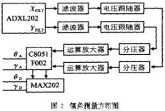測量電路方框圖如圖2所示, ADXL202輸出的電壓首先經低通濾波器慮波,再經電壓跟隨器進行阻抗匹配。當X, Y軸均處於(yu) 水平位置時,兩(liang) 路輸出電壓經分壓器分壓後為(wei) 1. 2V,當X, Y軸分別從(cong) - 90°轉到+ 90°時,經過放大後的電壓從(cong) 0V變到+ 2. 4V,以適應單片機C8051F002的A /D轉換器的需要,然後,用單片機進行線性化處理和溫度補償(chang) ,分別以模擬量從(cong) D /A轉換器DAC0,DAC1輸出,並以θA 表示俯仰角的模擬量輸出,γB 表示滾轉角的模擬量輸出;同時,俯仰角和滾轉角轉換為(wei) 數字量從(cong) 串行口RS232以數字量度輸出,分別為(wei) θD 和γD。