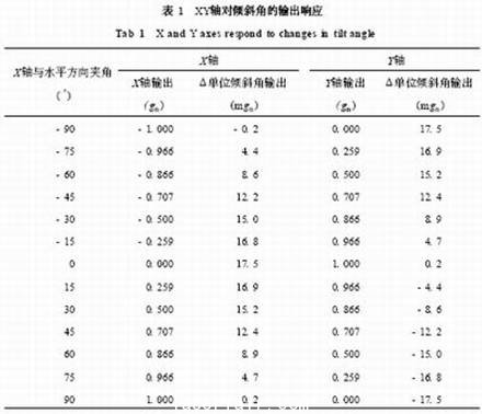 ADXL202用於(yu) 傾(qing) 角測量是最典型的應用之一,它以重力作為(wei) 輸入矢量來決(jue) 定物體(ti) 在空間的方向。當重力與(yu) 其敏感軸垂直時,它對傾(qing) 斜最敏感,在該方位上其對傾(qing) 角的靈敏度最高。當敏感軸與(yu) 重力平行時,每傾(qing) 斜1 °所引起輸出加速度的變化被忽略。當加速度計敏感軸與(yu) 重力垂直時,每傾(qing) 斜1 °所引起輸出加速度的變化約為(wei) 17. 5mgn ,但在45°時,每傾(qing) 斜1 °所引起輸出加速度的變化僅(jin) 為(wei) 12. 5mgn ,而且,分辨力降低。表1為(wei) X, Y軸在鉛垂麵內(nei) 傾(qing) 斜±90 °時,X, Y 軸的輸出。