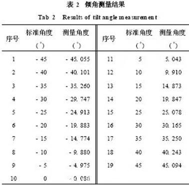 從(cong) 表2可以算出:傾(qing) 角最大誤差為(wei) - 0. 26°~0. 25°,而平均角度誤差為(wei) ±0. 135°, 分別為(wei) 滿量程的0. 57 %和0. 30 %。