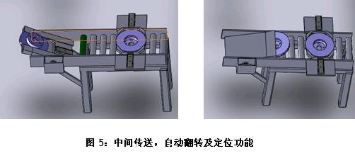當第一台立車完成加工,機床門開了及液壓卡盤鬆開後,氣缸先把刹車盤頂起,然後立即推出到機床間傳(chuan) 送帶上。該傳(chuan) 送帶把刹車盤滾運到圖5中翻轉位置。如圖5左圖所示,待檢測到刹車盤完全進入翻轉機構後,翻轉機構就翻轉。然後被滾運到對位處。兩(liang) 邊氣缸同時頂緊,完成對位。這個(ge) 位置就是給第二台立車的上料抓取處。