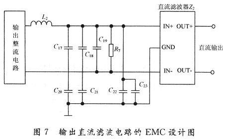結合混合參數方程及等效原理圖,根據第一條要求,應使濾波器的輸入導納和輸出阻抗盡可能小,即g11=g22=0。根據第二條要求,在低頻時反向電流增益g12和正向電壓增益g21的設計值要盡量為(wei) 1,而輸入導納和輸出阻抗盡可能小,即g12=g21=1,g11=g22=0。根據第三條要求,在高頻時,g11,g12,g21,g22都要盡可能的小。根據以上的條件,輸出直流濾波電路的EMC設計電路如圖7所示,L2,C17,C18組成LC濾波電路,減少輸出電壓、電流紋波的大小,從(cong) 而減小通過輻射傳(chuan) 播的EMI。濾波電容C17,C18應盡量采用多個(ge) 電容並聯,以減小等效串聯電阻,從(cong) 而減小紋波電壓。輸出電感L2應盡量大,以減小輸出紋波電流。