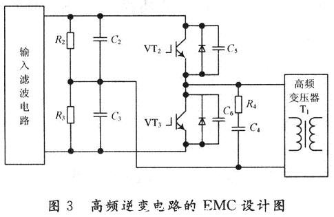 C2,C3,VT2,VT3組成半橋逆變電路,VT2,VT3為(wei) IGBT或MOSFET等開關(guan) 管。R4和C4構成EMI吸收回路,或在VT2,VT3兩(liang) 端並聯C5,C6,由於(yu) VT2,VT3開通和關(guan) 斷時,開關(guan) 時間很短以及引線電感、變壓器漏感的存在,回路會(hui) 產(chan) 生較高的di/dt,du/dt,從(cong) 而形成EMI。C4,C5,C6采用低感電容,其容量的大小由公式LI2/2=C△U2/2求得C的值(L為(wei) 回路電感,I為(wei) 回路電流,△U為(wei) 過衝(chong) 電壓值)。