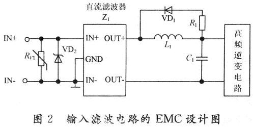 VD2為(wei) 瞬態電壓抑製二極管,Rv1為(wei) 壓敏電阻,它們(men) 都具有很強的瞬變浪湧吸收能力,能很好地保護後級元氣件或電路免遭浪湧電壓的破壞。Z1為(wei) 直流抗電磁幹擾濾波器,必須良好接地,且接地線要短。L1和C1組成低通濾波電路,當L1的電感量較大時,必須增加VD1和R1形成續流回路,以吸收L1斷開時釋放時的電場能量,否則,L1產(chan) 生的電壓尖峰就會(hui) 形成EMI。L1的磁芯使用閉合磁芯,可以避免開環磁芯的漏磁場形成EMI。C1采用大容量的電容,可以減少輸入線上的紋波電壓,減弱在輸入導線周圍形成的電磁場。