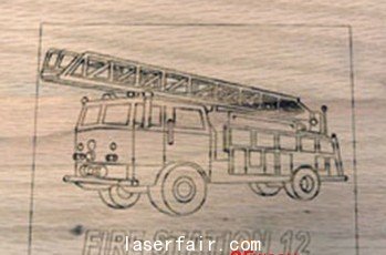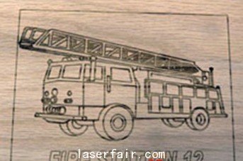 打標文件為(wei) 一個(ge) 導入的.eps矢量圖像——一輛消防車和TrueType®字體(ti) 的文本。我們(men) 在軟件中創建112.5 mm x 139.7 mm (4.43” x 5.5”)的邊界,功率設為(wei) 25 W,打標速度設為(wei) 254毫米每秒 (10 in/sec)