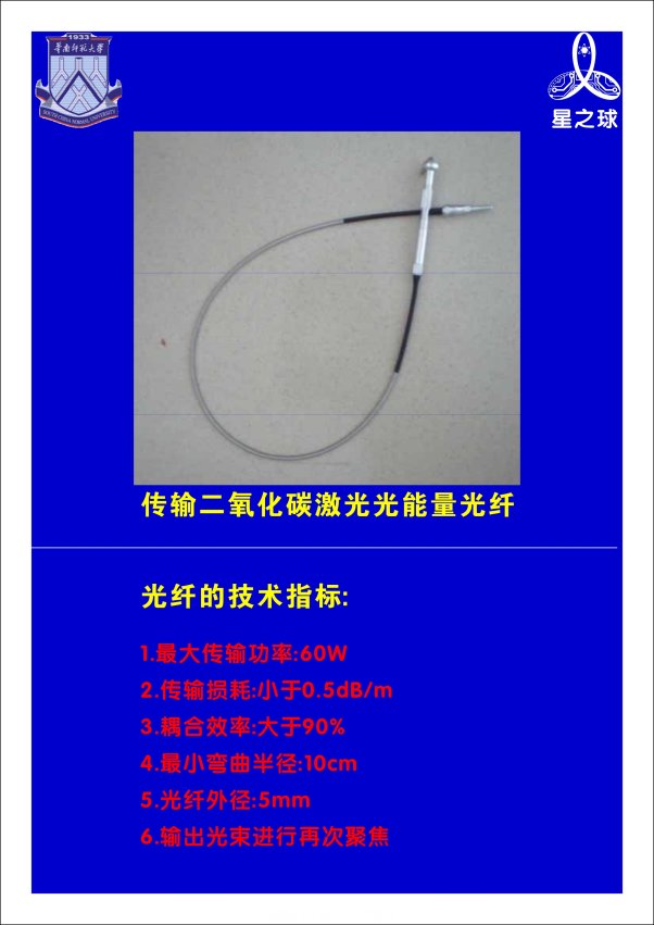 傳(chuan) 輸二氧化碳激光能量光纖是為(wei) 解決(jue) 二氧化激光的柔性傳(chuan) 輸,在國家“863”計劃項目等的支持下研製成功的高科技產(chan) 品,並取得了二項省部級科技發明二等獎。該光纖的綜合性能指標達到國際先進水平。傳(chuan) 輸最大功率可達60W(連續)、柔軟性好(最小彎曲半徑可達到20cm)、傳(chuan) 輸損耗低(小於(yu) 0.3dB/m)、光纖外徑(1.0~6.0mm)、光纖長度(<20m)。可應用於(yu) 二氧化激光雕刻、切割、工藝品加工和二氧化碳激光手術等,應用範圍廣,操作靈活方便。目前,二氧化碳激光的傳(chuan) 導基本上是以機械導光臂,或導軌移動的鏡片反射式為(wei) 主,應用上具有較大的局限性,難以實現三維加工,且二氧化碳激光器在工業(ye) 激光加工和激光手術方麵占有巨大的市場,每年達到數百億(yi) 的產(chan) 值,因此傳(chuan) 輸二氧化碳激光能量光纖作為(wei) 二氧化碳激光器的配套產(chan) 品,可擴展了二氧化碳激光器的應用領域,為(wei) 二氧化碳激光器實現多功能化和智能化創造了廣闊的發展空間。
