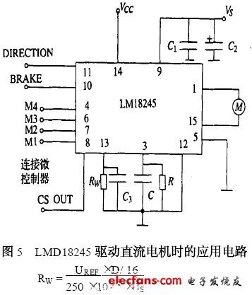 雖說LDM18245 的持續電流輸出的指標還不足SA60 的三分之一,但在控製方式上有它靈活方便的一麵,采用不同的聯接方式可以實現電機的不同的控製方式,獲得不同的控製性能,圖5 是用雙極性輸出方式驅動直流電機的實例。其中固定斬波時間為(wei) 1. 1 RC;電流傳(chuan) 感電阻RW 參考公式: