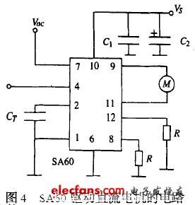 雖然這兩(liang) 個(ge) 芯片都是開關(guan) 式全橋功率驅動電路,由於(yu) 內(nei) 部結構的不同,工作方式也不盡相同,所以在作為(wei) 電機控製電路時,電路的工作方式也各有特點。圖4 是SA60 驅動直流電動機時的典型接線圖,在該圖中芯片被聯接成模擬輸入方式, 在數字輸入端(2 腳) 與(yu) 模擬地之間聯接一個(ge) 電容器CT ,改變它的大小,可以調整PWM 載波的頻率在22~250kHz之間變化的。