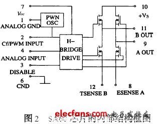 SA60 的內(nei) 部結構框如圖2 所示。電路共有12個(ge) 引腳,其中10、7 兩(liang) 腳分別是H 橋和PWM 及橋的驅動級電源端; 9、11 為(wei) 功率信號輸出端, 其輸出波形與(yu) 輸入信號的關(guan) 係是:9 腳輸出PWM 信號的占空比隨輸入信號電壓的增加而增大,11 腳卻反之; 1、6腳為(wei) 接地端, 前者是模擬接地端, 後者是功率接地端;8、12 端可以直接接功率地, 也可以通過一個(ge) 電阻接地,作為(wei) 限流感用,該端的電壓最大值為(wei) ±2V ;2、4 兩(liang) 端分別是模擬和數字控製信號的輸入端。