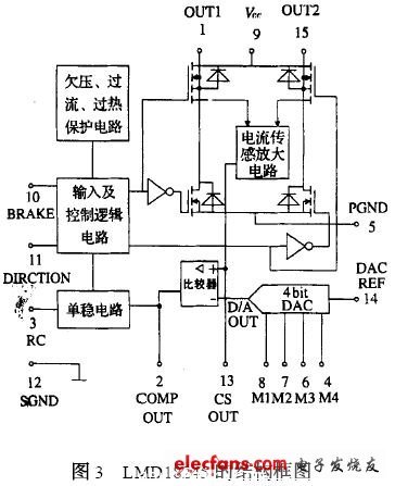LMD18245 的內(nei) 部結構框圖如圖3 所示。9 腳是電源端; 1、15 腳功率橋的輸出端; 12、5 腳分別是信號地和功率電路接地端; 4、6、7、8 是D/ A 轉換器的二進製數據輸入端, 其中4 腳為(wei) 二進製數的最高位;10 腳是緊急停止控製端,高電平有效; 11 腳為(wei) 方向邏輯輸入端;3 腳上聯接一個(ge) 並聯的RC 網絡,可將單穩脈衝(chong) 寬度設置為(wei) : 1. 1 RC 秒。此外, 該芯片還提供了電流傳(chuan) 感器放大輸出端(13 腳) ,比較信號輸出端(2 腳) ,和數模轉換參考電壓輸入端(14 腳) 。