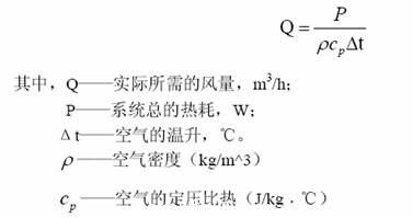 如果係統采用強迫風冷的散熱方式,選擇合適的散熱風機直接決(jue) 定了係統散熱狀況。要進行風機選型,首先需要確定係統所需要的散熱風量,通過下麵的公式計算: