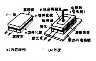 圖(1)示出了GaAs激光器的結構。它的核心部分是p—n結。p—n結的兩(liang) 個(ge) 端麵是按晶體(ti) 的天然晶麵剖切開的,稱為(wei) 解理麵,該二表麵極為(wei) 光滑,可以直接用作為(wei) 平行反射鏡麵,構成諧振腔。上下電極施加正向電壓,使結區產(chan) 生雙簡並的能帶結構及激光工作電流。激光可以從(cong) 一側(ce) 解理麵輸出,也可由兩(liang) 側(ce) 輸出。
