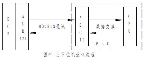 網絡采用RS485串行接口,通信媒體(ti) 由4芯屏蔽電纜連接主從(cong) 設備,傳(chuan) 輸距離最大達1.5Km,全雙工,串口設定波特率19200,8位數據位、偶校驗、1位停止位。DCS通信部分采用橫河型號為(wei) ALR121的通信模塊,並配套橫河提供的Modbus通信軟件包,該通信模塊最大通信數據容量4000字。PLC通信部分則采用Omron的C200H-ASCII 21可編程特殊單元模塊(以下簡稱ASCII模塊),該模塊支持BASIC語言編程,內(nei) 有200K字節的程序存儲(chu) 區,配備RS232、RS485通信串口各一個(ge) 。通過對該模塊的編程,可實現與(yu) 外圍設備的各種通信。本係統通過ASCII模塊與(yu) DCS基於(yu) Modbus協議的通信,將DCS的讀、寫(xie) 指令及數據做相應轉換,並與(yu) PLC的CPU單元進行數據存取交換,以實現上下位機控製信息的實時傳(chuan) 輸。如圖四所示。
