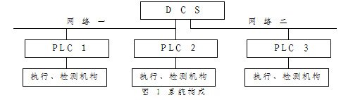 基於(yu) 通信實時性的考慮,將DCS與(yu) 3個(ge) PLC控製站分為(wei) 兩(liang) 個(ge) 相對獨立的通信網絡:PLC1和PLC2與(yu) DCS一端口組成網絡一,PLC3與(yu) DCS二端口組成網絡二。由於(yu) 上下位機均無麵向同一協議的通信設備,給設計造成了困難。經考慮,決(jue) 定采用Modbus通信協議,由其構成本分布式控製係統的通信網絡。