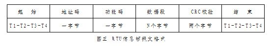 Modbus協議有兩(liang) 種傳(chuan) 輸模式:ASCII模式和RTU模式。同波特率下,RTU模式較ASCII模式能傳(chuan) 輸更多的數據,所以工業(ye) 網絡大都采用RTU模式。RTU模式下的信息傳(chuan) 輸報文格式如圖三。